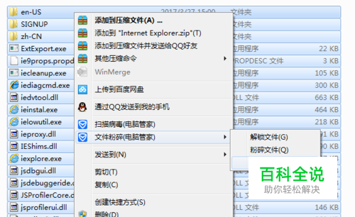 没有安装腾讯电脑管家或360安全卫士的要安装。打开IE11的安装目录,即C:\Program Files (x86)\Internet Explorer和C:\Program Files\Internet Explorer两个目录,分别选中全部文件(ctrl+A)右键选择文件粉碎,选择删除文件如下图: