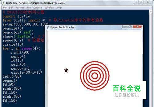 第四,再次点击File-->New File,再新建一个脚本文件,然后输入如下代码,绘制同心圆。 # 20181223绘制同心圆 import turtle from turtle import * # 导入turtle库中的所有函数 setup(500,500,100,100) pensize(5) pencolor('red') shape('turtle') # 设置笔尖类型为海龟turtle speed(0.7) # 设置绘制速度 circle(15) for i in range(4): right(90) penup() fd(15) seth(0) pendown() circle(30+i*15) left(-90) penup() fd(50) right(90) fd(150) right(90) fd(150)