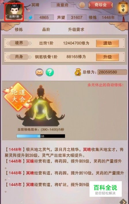 进入婴出窍界面后,在元婴出窍界面下方有三种经书可以购买。要想挂机刷图,必须学习一种经书。