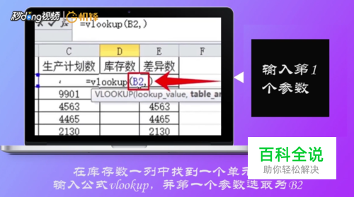 在库存数一列中找到一列单元格,输入公式vlookup,第一个参数选取为“B2”。