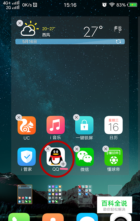 将“显示分身按钮”选项后面的灰色圆球点亮后,返回手机桌面,找到QQ,手指长按,我们会看到QQ图标右下角出来一个“+”号。