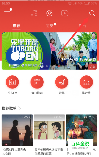 首先我们需要正常打开手机网易云音乐,然后点击右上角的搜索功能搜索出歌曲(如下图)。