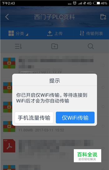 点击后就会把这个选项给关闭了,下方会提示【仅wifi传输关闭,使用手机流量传输】,这样就可以在没无线网的情况下上传和下载了。