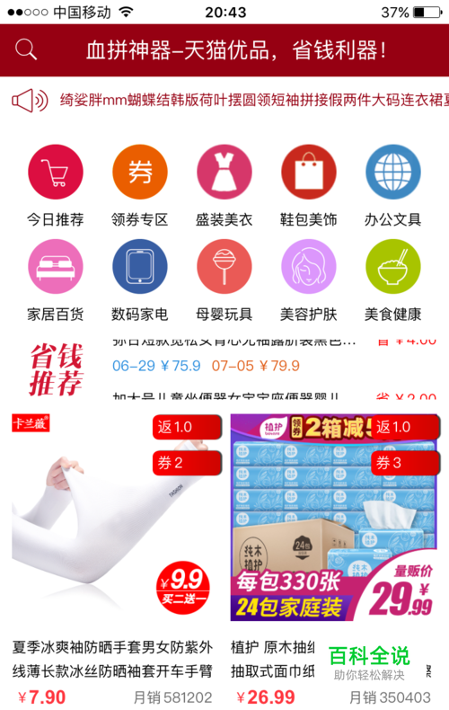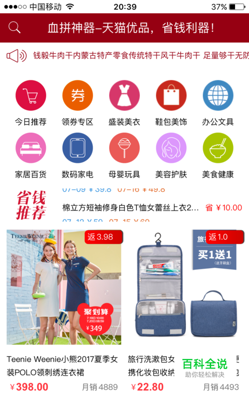 在安装后,点击打开就可以看到这款APP的首页了。里面有今日推荐和领券专区等十个栏目。你可以直接浏览商品,也可以点击首页左上方的放大镜输入你需要的商品名称关键词进行搜索。