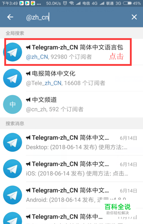 第四步:输入“@zh_cn”,点击第一个“Telegram-zh_CN简体中文语言包”