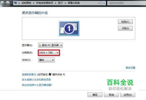 右键单击----右键菜单中的屏幕分辨率----分辨率下拉菜单中-----把滑块移动到最顶端(推荐)-----应用。 如上图