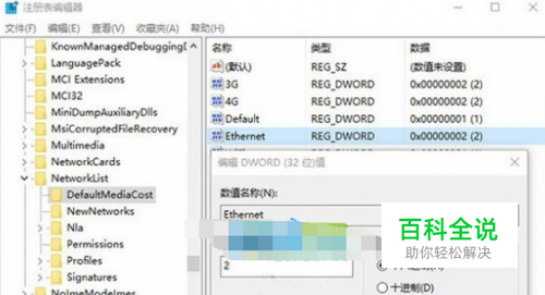 4、在右侧找到Ethernet,该项即为本地连接(以太网),双击,将其值修改为2; 5、重启后即可将本地连接设置为按流量计费网络。