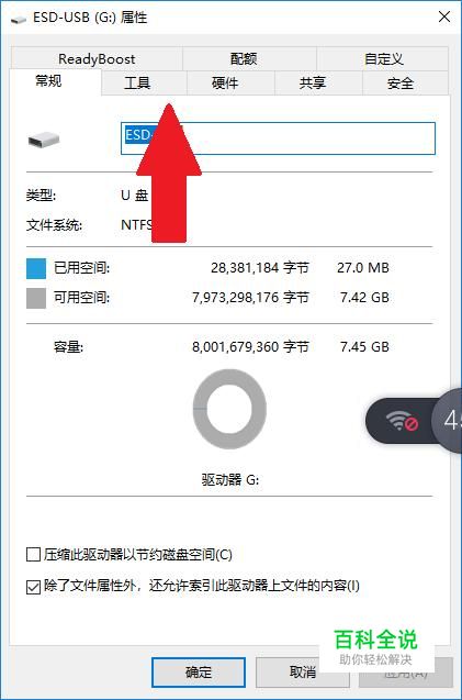 然后在弹出的“属性”窗口,选择“工具”选项卡,点击进入。
