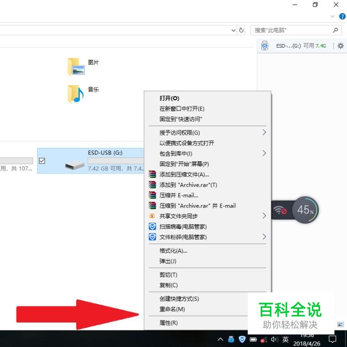首先我们进入电脑的资源管理器,右击U盘名称,从弹出的菜单选项中选择“属性”。