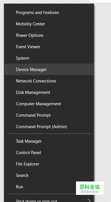 在左下角Windows图标处右键,选中“设备管理”