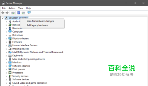 在设备管理窗口的最上方下拉栏右键单击,选中第二个选项“添加硬件”。