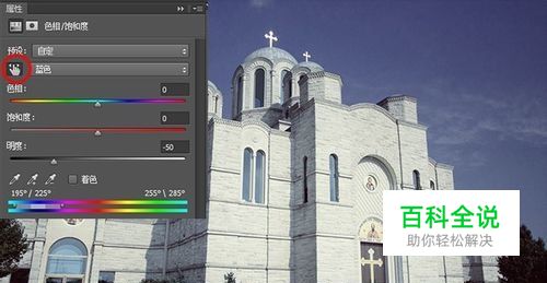 Step 1:打开PS,导入图片,ctrl+j复制图层,添加一个“色相/饱和度”调整图层。单击带有左右箭头的小手图标,然后在图像中的蓝色天空区域单击。 将明度调整到-50,使天空变暗。
