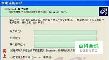设置用户名密码 在“用户名”文本框中输入所使用的用名称(ADSL账号),在“密码”文本框中输入密码,在“确认密码”文本框中重复输入密码确认,勾选“任何用户从这台计算机连接到Internet使用此帐户名和密码”和“把它做为默认Internet连接”->下一步;