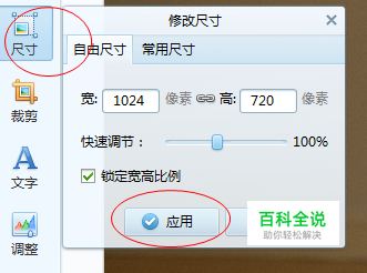 然后点击左侧的工具面板中尺寸按钮,并设置图片的宽和高的像素,同时还可以勾选锁定宽高比例的选项等比例放大和缩小照片,最后点击应用按钮,如图所示: