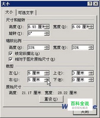 第2步,在打开的“大小”对话框中,切换到“大小”选项卡。在“裁剪”区域分别设置左、右、上、下的裁剪尺寸,并单击“确定”按钮,如图所示。