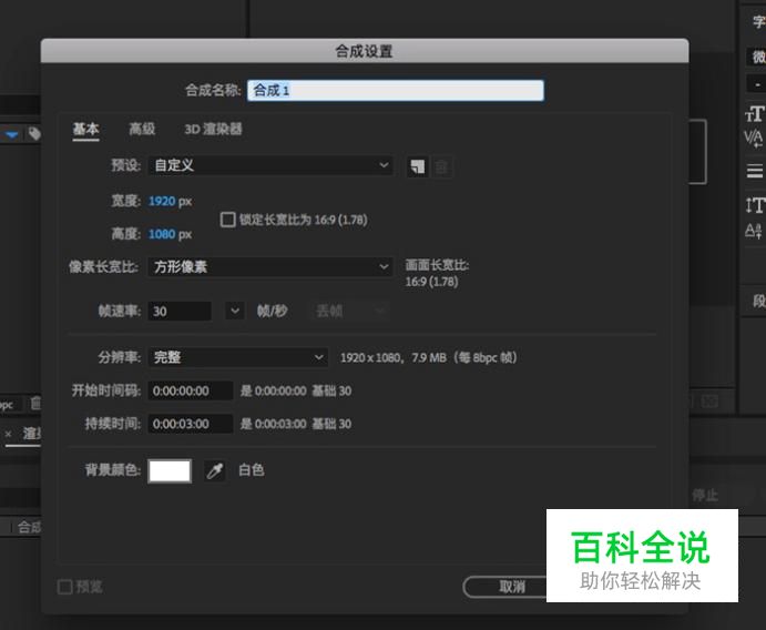 在纯色设置面板,注意宽度以及高度要和我们合成是一样的,颜色就自由选择。