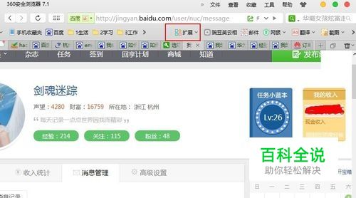 打开360浏览器,打开浏览器后在工具栏中找到下图中所示的“扩展”按钮