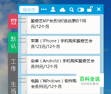 爱奇艺VIP会员5折购买活动:爱奇艺(Windows)电脑软件、网页版(Web)、苹果(iPhone)、安卓(Android)怎么开通爱奇艺会员VIP账号更省钱;下面是小编使用敬业签桌面便签软件统计记录的爱奇艺不同的设备购买爱奇艺会员VIP账号费用不同,其中苹果(iPhone)手机APP购买爱奇艺会员价格最高;