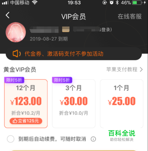 前二年就是参加了爱奇艺VIP会员购买5折的活动,当时并不知道一个爱奇艺会员VIP账号开通一年费用还有不同,直接花了123元/年购买了5折爱奇艺会员到2019年8月27日到期;