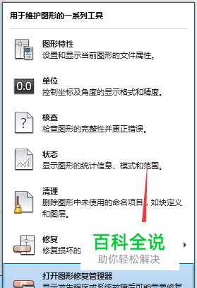 然后在弹出的用于维护图形的工具框中,点击图示位置的“修复”,进行图形修复工具箱选择。