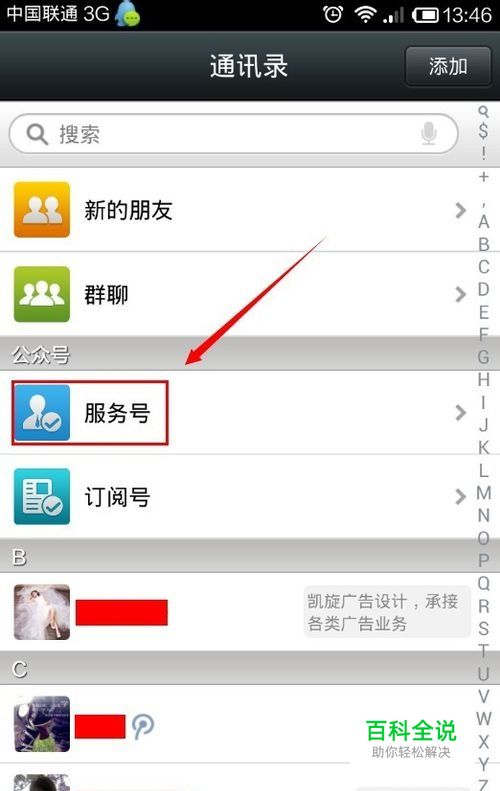 进入微信以后,点击【通讯】---【服务号】
