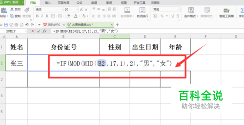 性别:点击性别栏下的单元格,在单元格中输入公式“=IF(MOD(MID(B2,17,1),2),"男","女")”,B2表示身份证号码所在的单元格,然后点击回车键,性别就自动显示了;