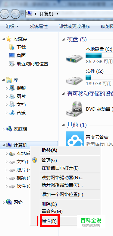 打开win7的资源管理器,右键单击我的电脑,打开属性面板