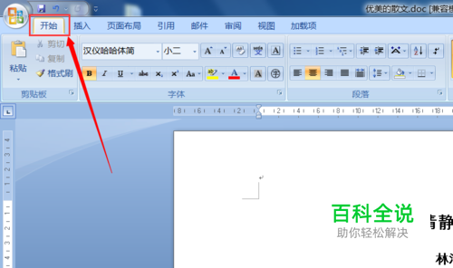 打开需要添加花边的Word文档, 点击功能区的“开始”选项卡。