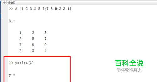 第五步当有两个输出参数的时候,分别返回行数和列数结果,在命令行窗口中输入[y3,y4]=size(A),按回车键,可以看到返回y3的结果是行数,y4的结果是列数,如下图所示: