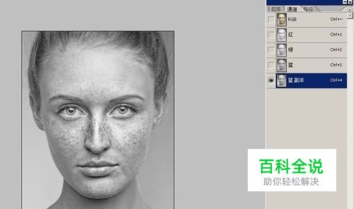 打开原图,复制一个图层,进入通道。观察红、绿、蓝三个通道,比较之下,蓝色通道的质感较强,特别是将斑点部分清晰展露。记住通道就是选区,它是独立的并依附于原图用来保存选择区域的黑白图像,默认白表示被选择黑表示不在范围内。