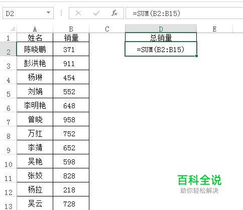 在总销量的下面的单元格中输入公式:=SUM(B2:B15)。
