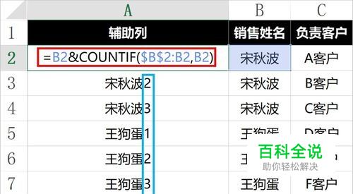 在销售姓名左边建立辅助列, 将销售姓名出现的次数加在销售姓名后面。 =B2&COUNTIF($B$2:B2,B2) COUNTIFS函数相关知识点请参考下方经验:
