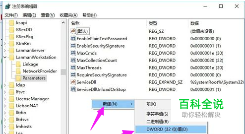 依次展开“[HKEY_LOCAL_MACHINE\SYSTEM\CurrentControlSet\Services\LanmanWorkstation\Parameters] ”项,在右侧空白处右击鼠标,从其右键菜单中选择“新建”-“DWORD值(32位)”项。