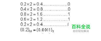 0.2乘以2,取整后小数部分再乘以2,运算4次后得到的整数部分依次为0、0、1、1,结果又变成了0.2, 若果0.2再乘以2后会循环刚开始的4次运算,所以0.2转换二进制后将是0011的循环,即: (0.2)10=(0.0011 0011 0011 .....)2循环的书写方法为在循环序列的第一位和最后一位分别加一个点标注