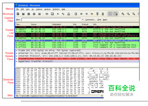 Wireshark是世界上最流行的网络分析工具。这个强大的工具可以捕捉网络中的数据,并为用户提供关于网络和上层协议的各种信息。与很多其他网络工具一样,Wireshark也使用pcap network library来进行封包捕捉。可破解局域网内QQ、邮箱、msn、账号等的密码!! wireshark的原名是Ethereal,新名字是2006年起用的。当时Ethereal的主要开发者决定离开他原来供职的公司,并继续开发这个软件。但由于Ethereal这个名称的使用权已经被原来那个公司注册,Wireshark这个新名字也就应运而生了。 在成功运行Wireshark之后,我们就可以进入下一步,更进一步了解这个强大的工具。下面是一张地址为192.168.1.2的计算机正在访问“openmaniak.com”网站时的截图。
