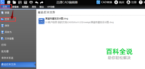 首先打开我们的CAD编辑器软件,CAD编辑器软件打开之后,点击“文件”下的“打开”。