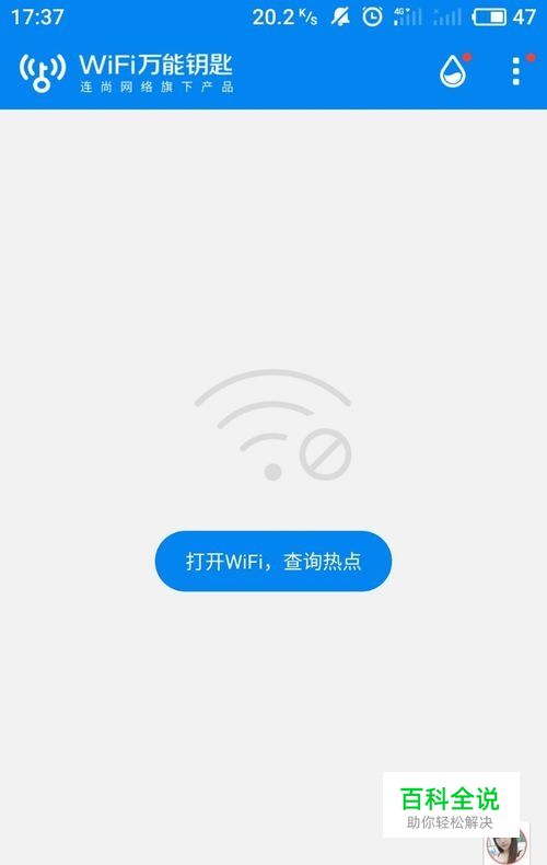 接着我们可以点击wifi 万能钥匙,打开,此时页面会显示,打开wifi,查询热点。我们根据提示将wifi开启。