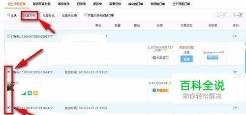 进入已卖出的宝贝后,勾选你要用同一个单号一起发货的订单,再点击“批量发货”