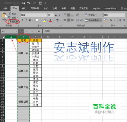 如图所示,把B列格式用【格式刷】 刷为同格式!