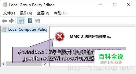 由于Windows系统默认是禁止Guest账户从网络登录的,我们需要解除这个限制。首先想到的是用组策略编辑器gpedit.msc。 但是Windows 10家庭版没有组策略编辑器,我们先尝试用U盘把Windows 10专业版的组策略编辑器文件复制过来运行,结果在Windows10家庭版上用不了。