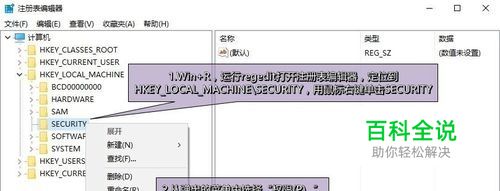 只好通过修改注册表来解除了限制。 1.Win+R,运行regedit打开注册表编辑器,定位到HKEY_LOCAL_MACHINE\SECURITY,因为受权限限制,这个表项正常情况下此时无法向下展开。 2.修改HKEY_LOCAL_MACHINE\SECURITY权限。 用鼠标右键单击SECURITY,从弹出的菜单中选择“权限(P)...”