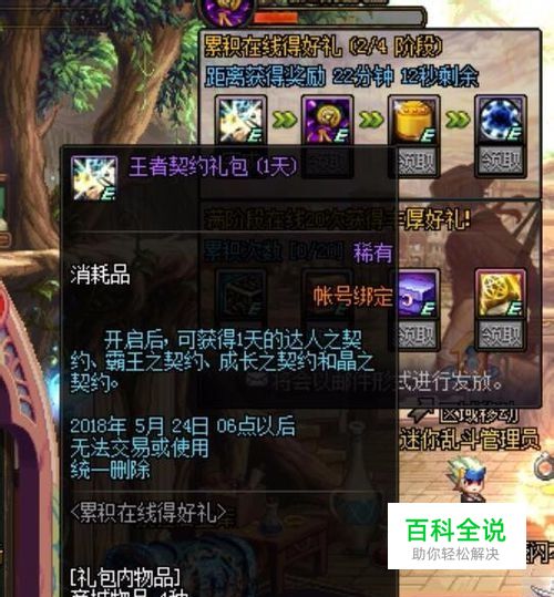 首先来看站街时长可以获得的奖励,第一个奖励是王者契约礼包(1天),每日登陆游戏在线时长到达30分钟即可获得。