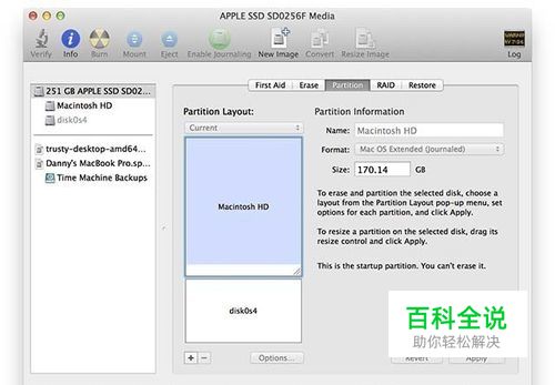 当你完成上一步后,你的Mac Book Pro就做好安装的准备了。 打开Disk Utility(磁盘工具), 点击左边选择你的硬盘, 选择Partitions(分区)标签页。 把Mac分区缩小到你喜欢的大小 - 我们将会用新创建的可用空间来安装Ubuntu。