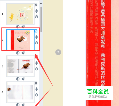首先我们需要建立一个工程,也就是说需要有一个多媒体幻灯片,这里我们可以直接导入我们的PPT文件,如果说是自己用focusky动画演示大师创建的也是可以的。然后我们找到我们需要设置动画的帧,也就是PPT当中的幻灯页。然后点击下图标出的图标,也就是动画设置。