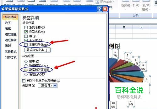 弹出的对话框中单击“ 显示引导线”取消打√,单击选“ 数据标签外”,再单击“ 关闭”即可。