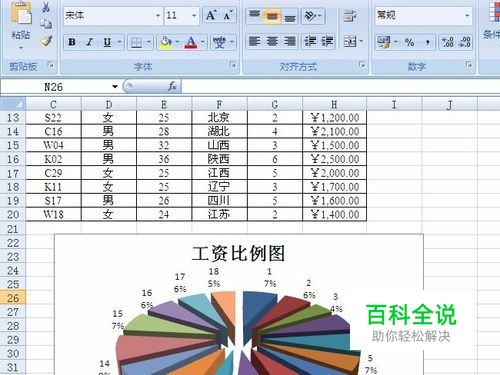 选定工资列,单击“ 插入”菜单→ 饼形→单击分离型三维饼形,结果如图: