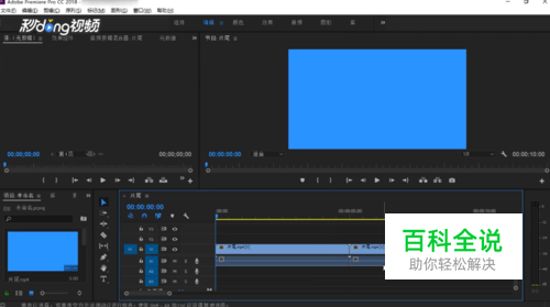 打开“Pr”并导入两段视频,将时间标尺拉至两个视频正中间。
