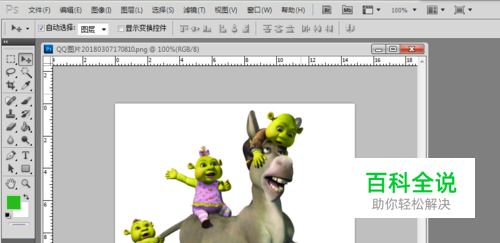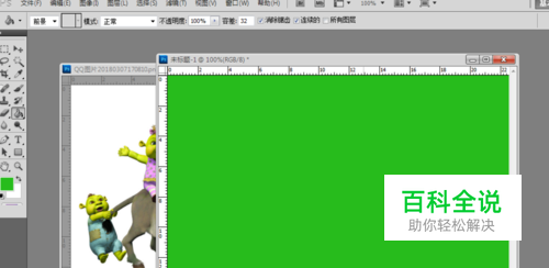 再利用移动工具按shift同时移动到绿色区域,这样就成功地将驴子等物选中并移到另一张图上了。