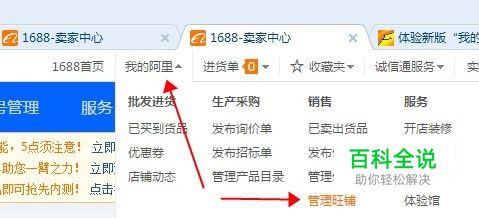 在页面的最上方【我的阿里】里面,找到【管理旺铺】打开