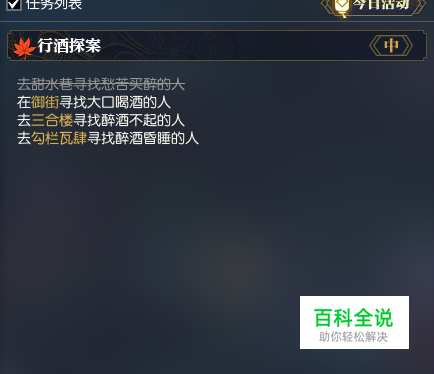 逆水寒奇遇行酒探案任务让玩家找四个人,分别是甜水巷买醉的人,御街喝酒的人,三合楼找醉酒不起的人,勾栏瓦肆找喝酒昏睡的人,这几个人具体位置如下: